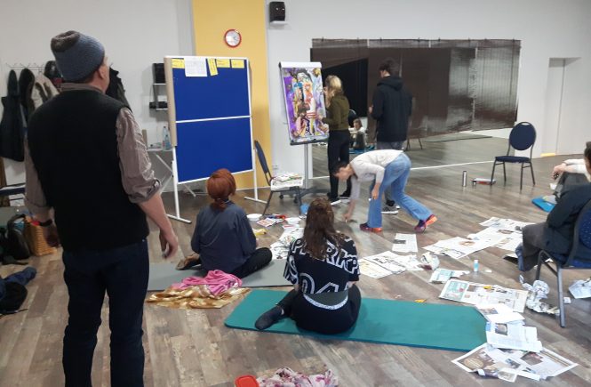 Gruppenbild: Eine große Leinwand, verschiedene Farben (Öl· oder Pastellkreiden). Die Gruppe beschließt zunächst, welche Regeln sie sich gibt: für die Farben, für die Formen, für die Größe der Formen und ob die Formen sich überschneiden dürfen usw.